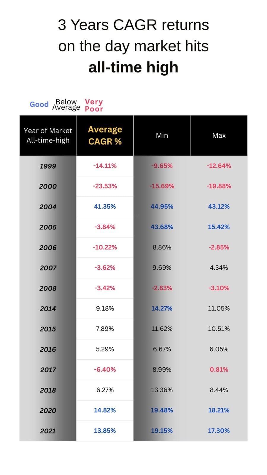 Its not easy to resist investing when you see markets going up month-on-month, however, history has a lesson for all of us and please find below the reason to be be extremely cautious when markets touch all time highs